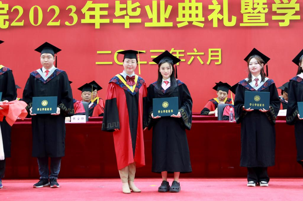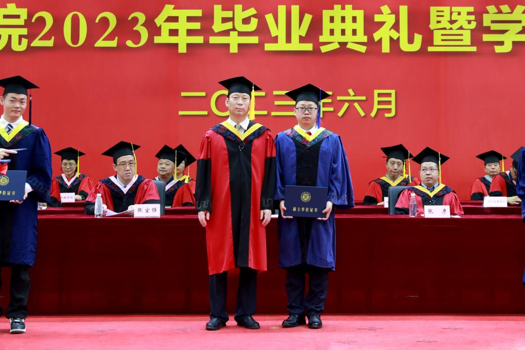典礼仪式上,对优秀毕业生和优秀毕业生党员进行了表彰,校领导为毕业生代表扶正流苏,颁发学位证书。