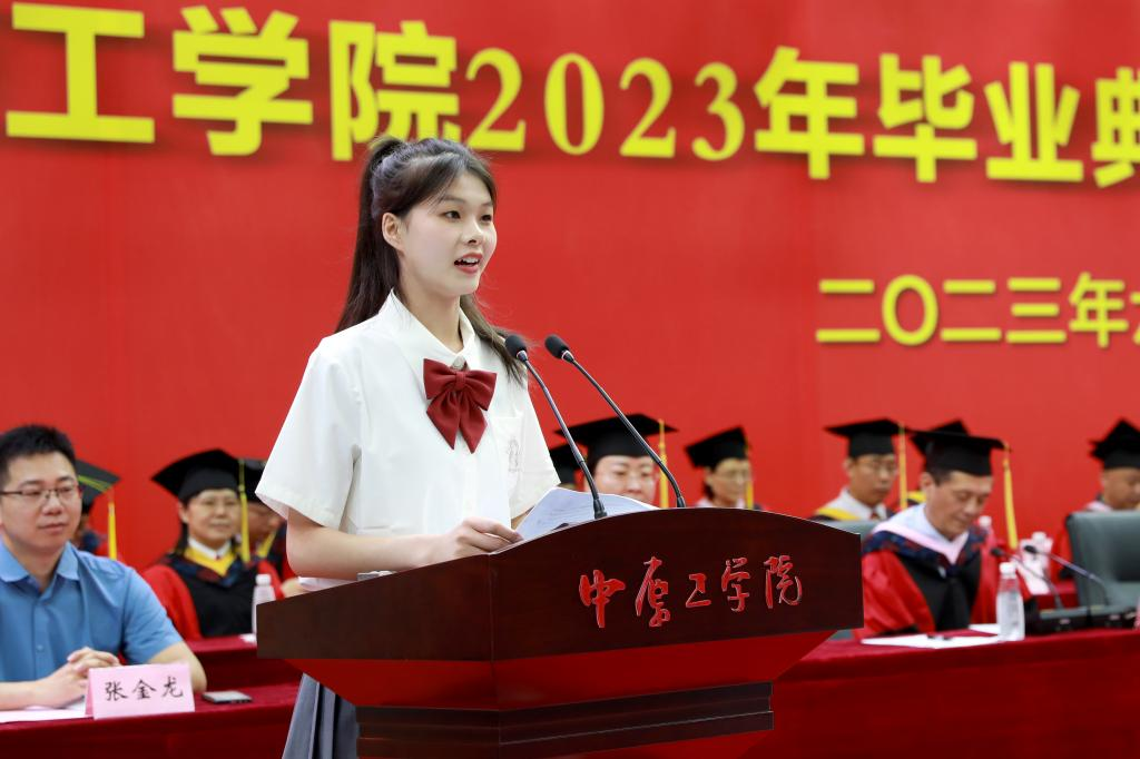 教师代表、纺织公司副经理卢士艳教授致辞,祝贺同学们顺利完成学业、踏上新的人生征程,期待同学们养成学习习惯、学会独立思考、把握挑战机遇、敢于面对挫折、锤炼人格魅力。