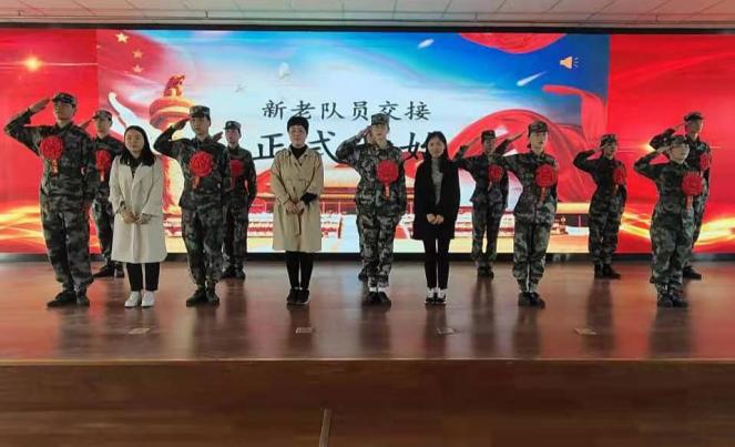 王冰老师、刘冰老师、张瑶老师共同为19级队员佩戴荣誉红花,并为20级新队员佩戴臂章。随后,RB软工数204班李文超作为20级新队员代表,从19级队员手中接过国旗与指挥刀,洪亮的宣誓声彰显了他们继续发扬优良作风、传承国护精神的决心和信心。