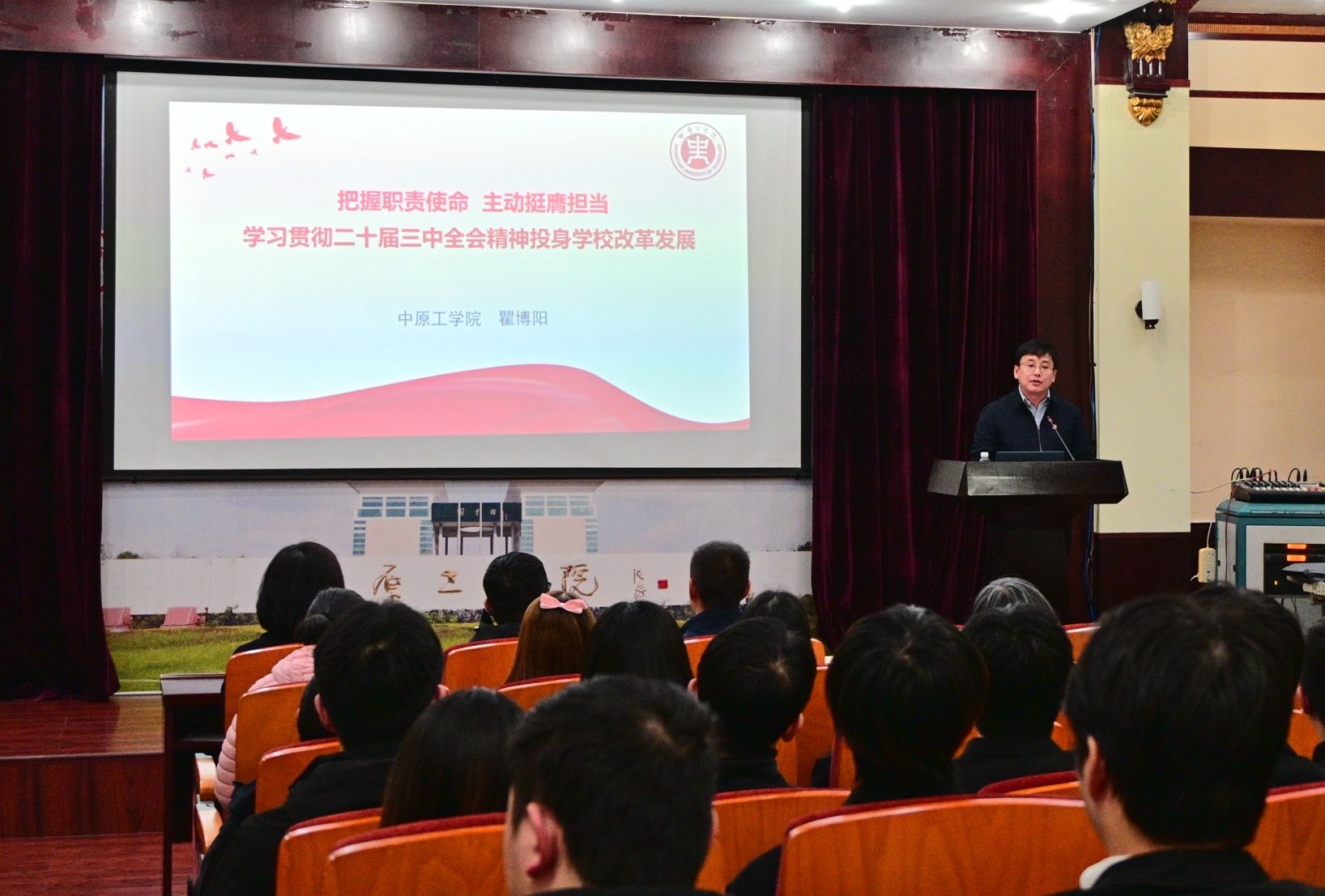 为全面深入学习领会党的二十届三中全会精神,11月18日下午,副董事长瞿博阳在中原校区图书馆报告厅为公司全体教师党员和员工党员代表,开展了一场专题宣讲报告会。报告会由公司党委书记王雪芳主持。