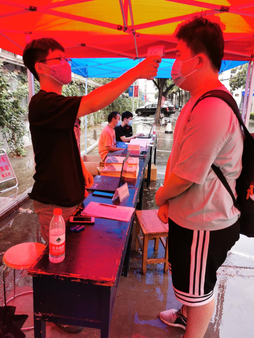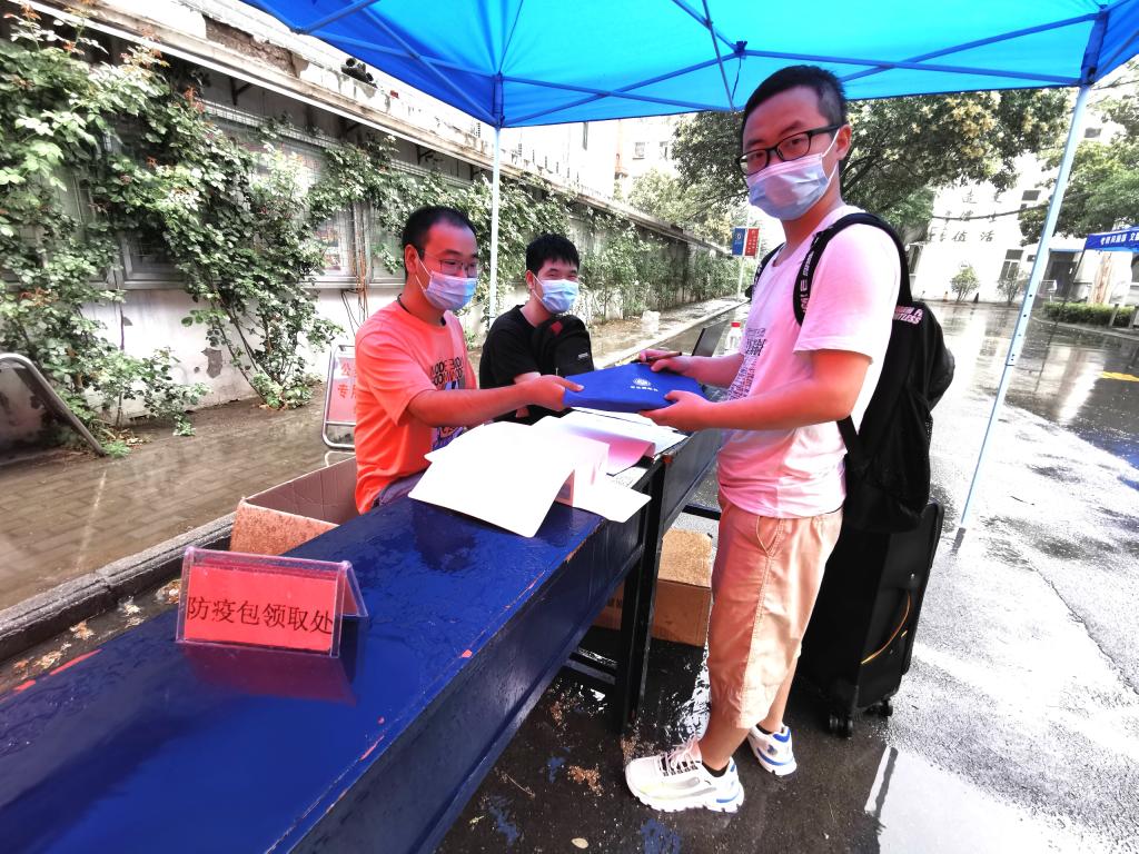 西区校园早已提前设立好了隔离通道、返校接待点、临时休息区等区域,全体辅导员和志愿者坚守岗位,以饱满的热情迎接毕业生们重返校园。在西区门口,返校员工在老师和志愿者的指引下先对随身行李进行杀菌消毒,为每名同学发放全新的一次性医用外科口罩并提醒他们更新,员工通过校门口扫码验证信息,通过体温检测无异常后方可进入校园。在接待点前,员工一一进行手部消毒、体温复检、出示健康码、提交返校申请书和承诺书、领取防疫物资健康包以及返校入住凭条等步骤。整个环节严谨细致,贴心周到。校医院也设置了留观区,对体温异常的员工进行复检,并依据返校医疗应急处置流程进行分类处置。