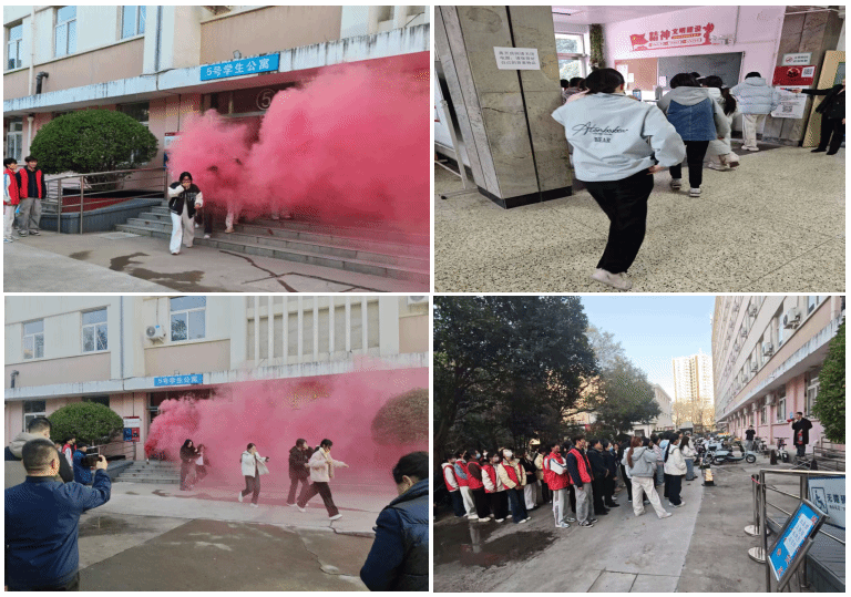 培训结束后,在5号公寓楼开展了火灾应急疏散演练。预警声响起,宿舍管理员打开疏散通道,员工志愿者提醒并督促撤离。同学们用湿毛巾捂住口鼻,弯腰低姿快速疏散,引导人员协助防止踩踏。全体员工安全集结至指定区域并完成人数清点。