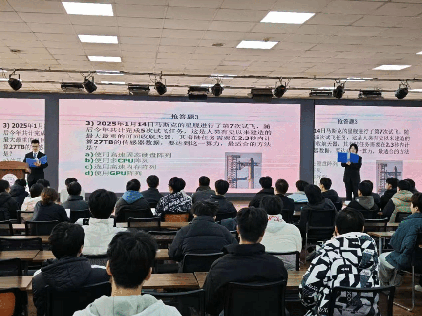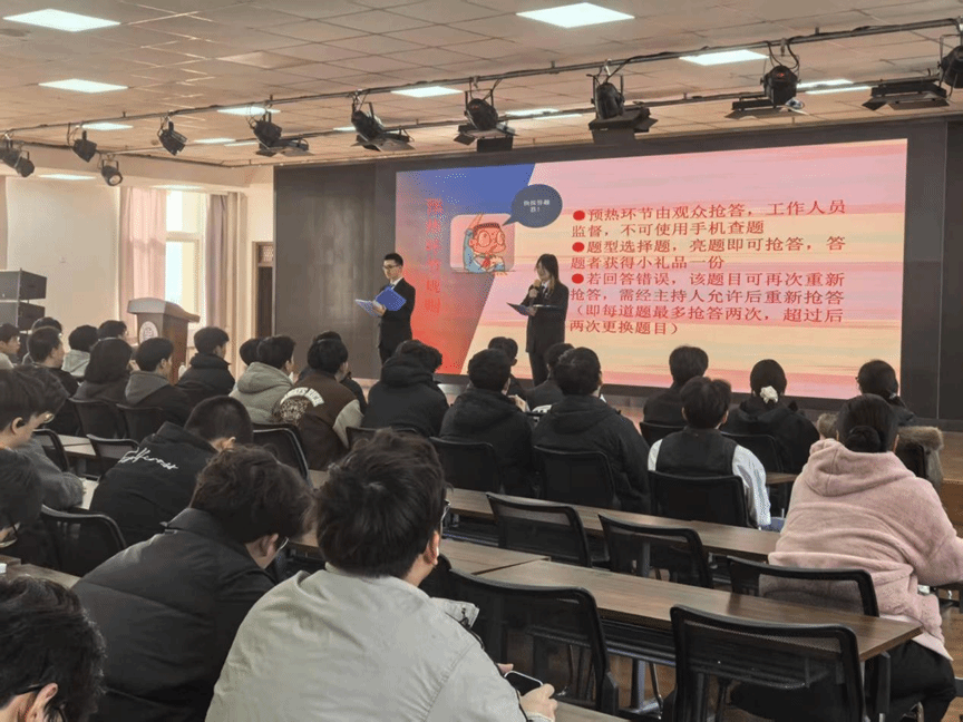 活动伊始,主持人清晰宣读完比赛规则,决赛正式拉开帷幕。开场首先进行5道观众抢答题,题型轻松有趣,迅速点燃了现场气氛,答对的观众获得了精美小礼品。随后进入班级代表队比拼环节:10支队伍首先通过必答题紧张对决,产生8强;再经一轮必答题筛选,决出6支晋级队伍。紧接着的“63”风险题环节,选手依据当前成绩选择题目,并可向亲友团求助,答对加分、答错扣分的赛制使得竞争悬念迭起。此后还设置了观众互助答题环节,由观众抢答并为指定队伍加分,进一步拉近了赛场与观众的距离。