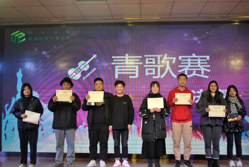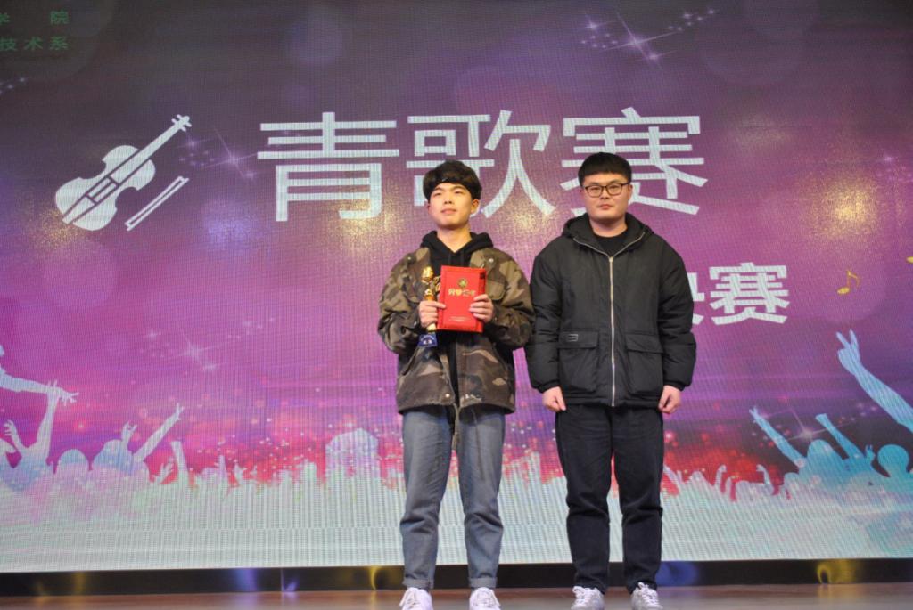 在决赛现场,经过第两轮激烈的比拼,黄河同学获得冠军,王子昭同学获得亚军,“忽然之间”组合、高嘉、祝孟迈、王奔、刘航成、王灿五位同学获得优秀歌手奖,学工办刘彦博老师和员工会主席李鑫洋为获奖选手颁奖并合影留念。