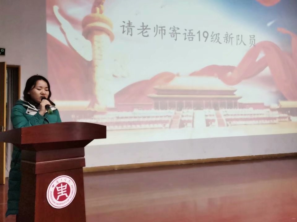 随后学工办张瑶老师上台寄语19级新队友,张瑶老师在讲话中表示了对国旗护卫队昨日成绩的肯定,公司不会忘记老队员的辛勤付出,也相信新队员会发扬国旗护卫队的优秀传统,弘扬自强不息的精神。同样,优秀的国旗护卫队新队员以庄严的宣誓对老师的信任做出了回应。