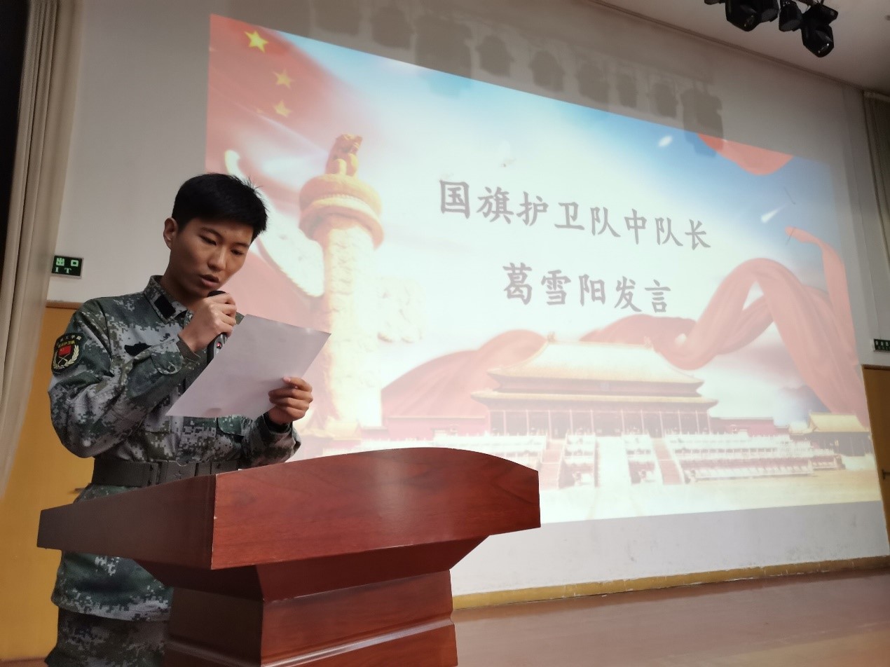 大会伊始,18级国旗护卫队中队长葛雪阳代表18级国旗护卫队上台发言,他强调了国旗护卫队始终以“青春学子,心系国家,携手共进,责任至上”为口号,以“用行动体现自我价值,用热血谱写国旗魅力”为宗旨,以“宣扬爱国主义、爱护国旗”为主题,是公司宣扬爱国主义精神的重要组织之一。