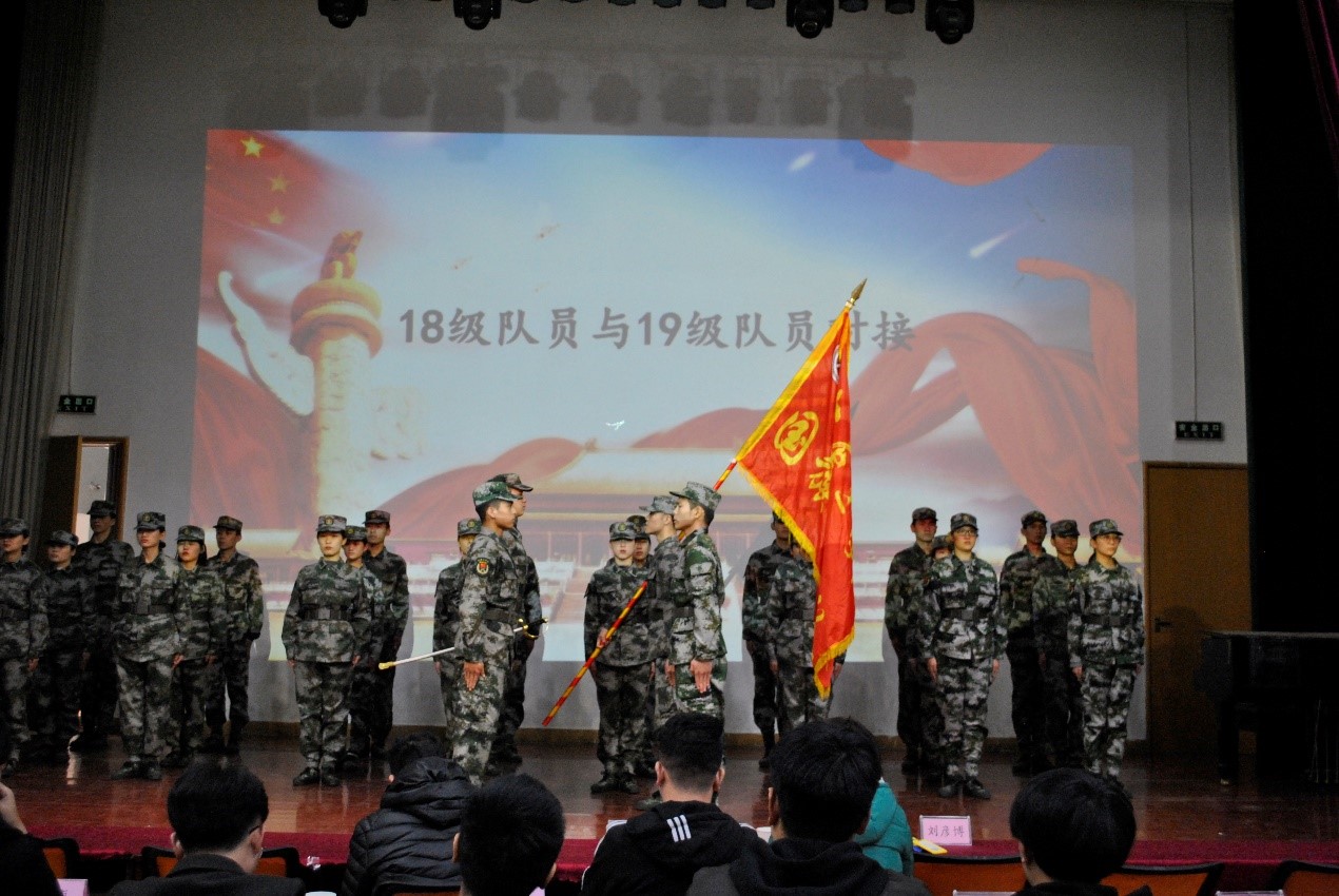 发言完毕后,国旗护卫队新老队员开始交接,18级国旗护卫队将队旗和指挥刀授予新国旗护卫队。