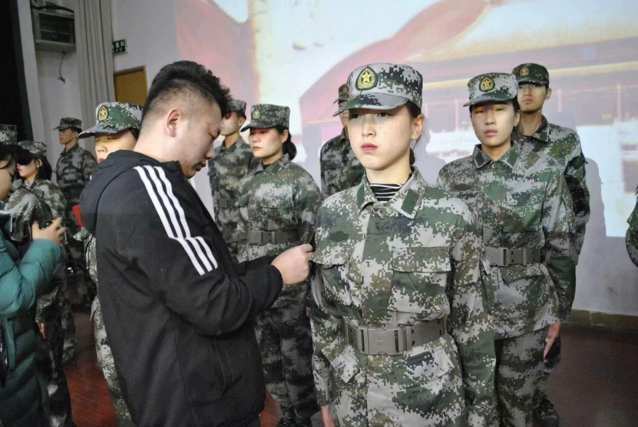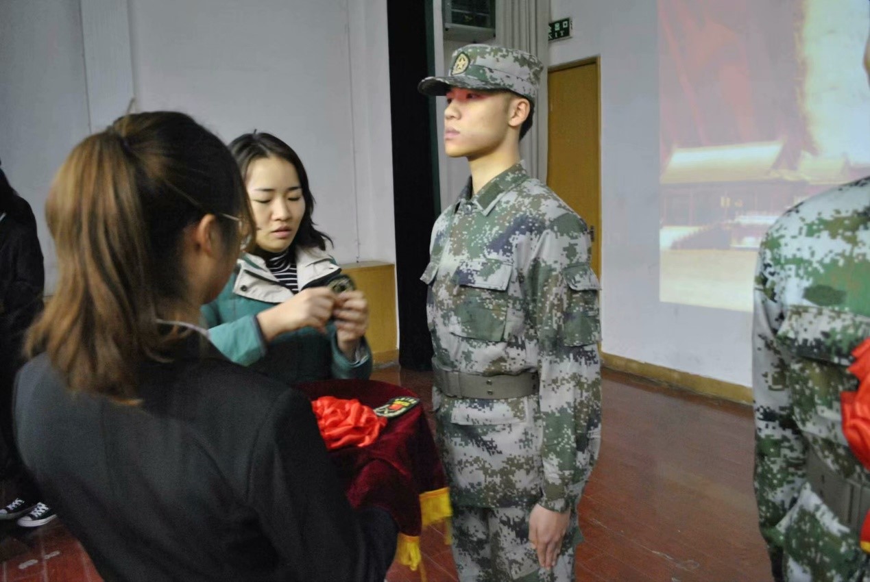交接结束后,学工办张瑶老师,刘欢老师为18级国旗护卫队队员摘军衔,佩戴荣誉红花。