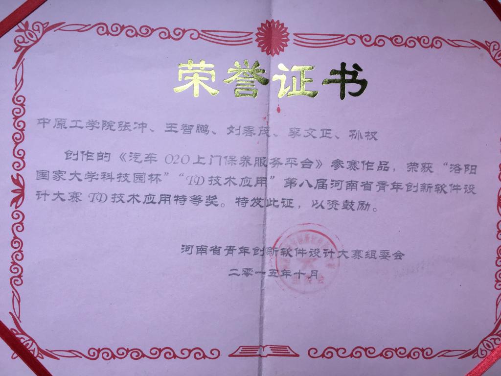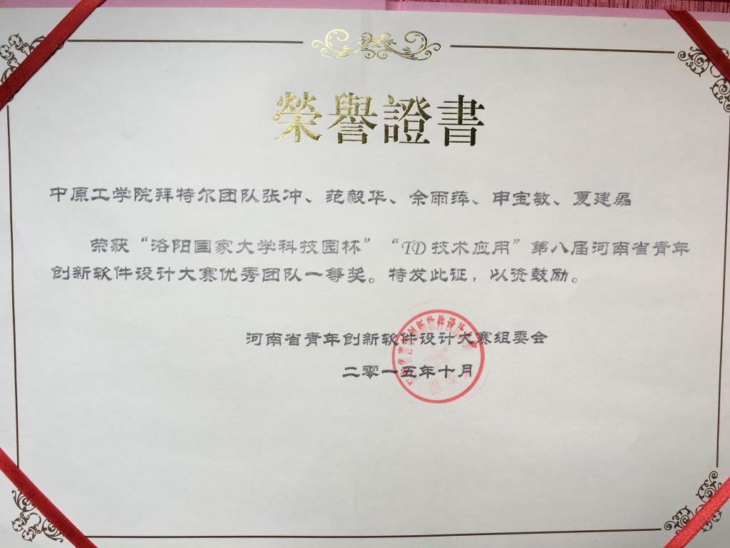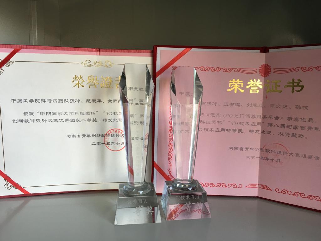 2016年4月11日,第八届河南省青年创新软件设计大赛落下帷幕,公司在本届赛事中成绩优异,共捧得六项大奖,获得组委会授予的“优秀组织奖”,同时,张冲、范毅华、余雨萍带领的拜特尔团队荣获大赛《优秀团队一等奖》,报送的作品《汽车O2O上门保养服务平台》荣获TD技术应用专项奖特等奖,公司余雨萍、郭丽、张文宁、张冲老师分别指导的《智能课堂助手》《埃扣智能》《大型停车场智能管理控制系统》《基于三维地图的居民信息管理平台》荣获三等奖。