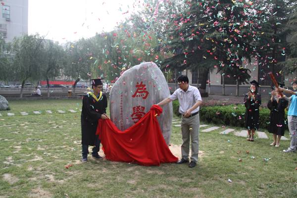 典礼前,伟德体育官方网站600多名2012届毕业生为母校捐赠了纪念石。伟德体育官方网站经理崔世忠亲手与毕业生代表王赛广为纪念石揭幕。礼花飞舞、笑脸灿烂,纪念石上的赤红大字“为学”脱颖而出。纪念石是全体毕业生为母校送上的厚重礼物,石刻取字“为学”二字,是从600多名毕业生征集而来,旨在借鉴古文《为学》之名言警句“天下事有难易乎?为之,则难者亦易矣;不为,则易者亦难矣。人之为学有难易乎?学之,则难者亦易矣;不学,则易者亦难矣”之作学问之真谛,表达了莘莘学子之贵在立志,事在人为,立志而为的勤奋、坚定的为学态度。