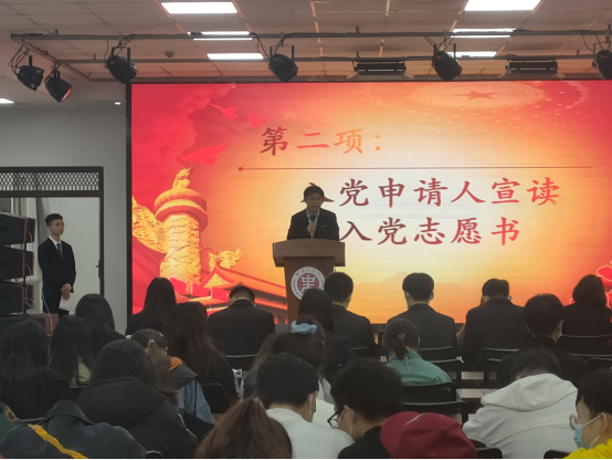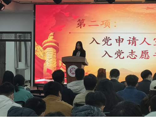此次会议严格按照党员发展程序和上级党委要求,在清点人数后,大会进行第一项,全体起立,奏唱国歌。随后,发展对象逐一上台宣读《入党志愿书》,向党组织汇报个人情况,并表明自己的入党动机及决心。入党介绍人向大会介绍发展对象主要政治思想、学习工作等真实情况,支部书记常星同志向大会报告发展对象的考察表现以及综合政治审查情况等。大会党员对发展对象是否符合党员条件发表了意见,有表决权的同志通过无记名投票的方式逐一进行表决。大会认为,晁颖欣、易成龙等12名同志基本符合党员条件,一致通过接收晁颖欣、易成龙等12名同志成为中国共产党预备党员。
