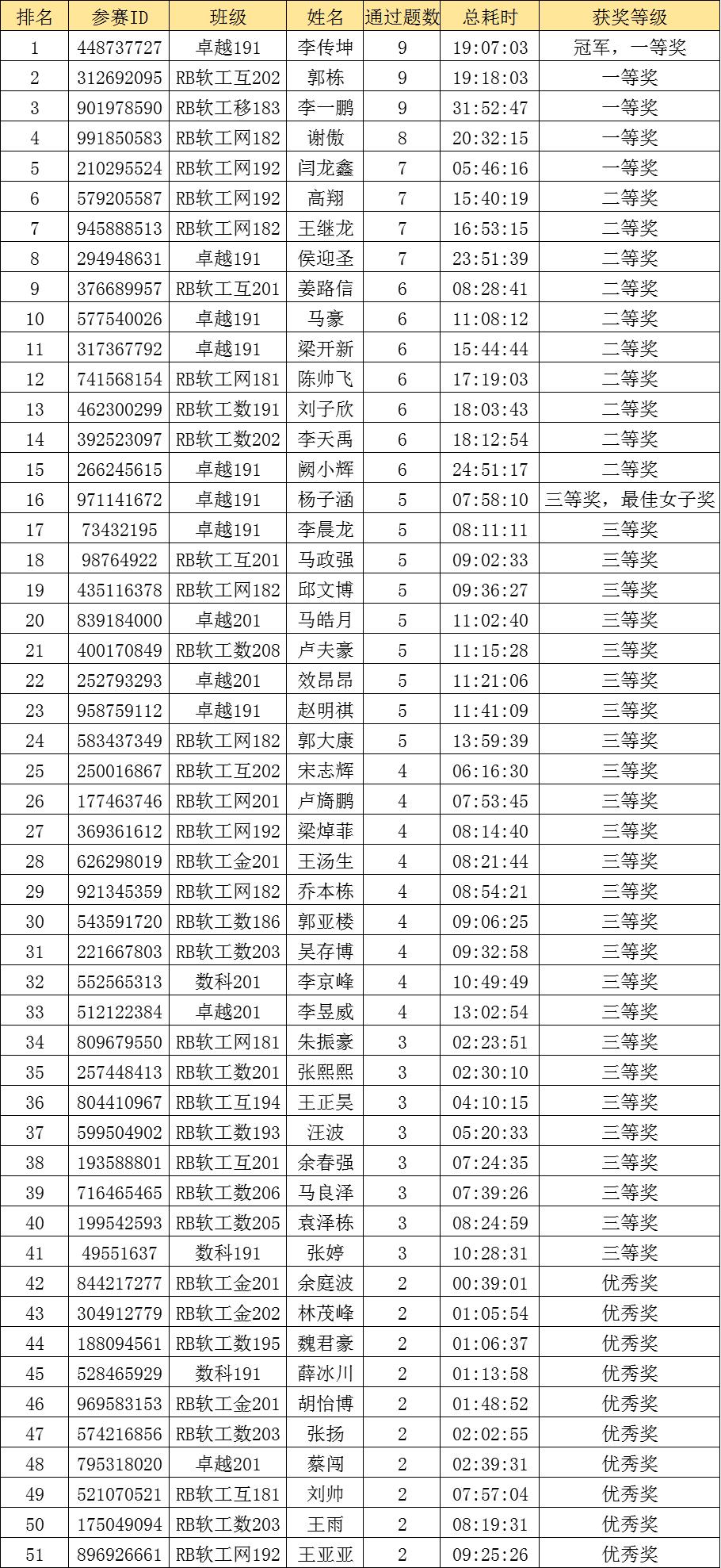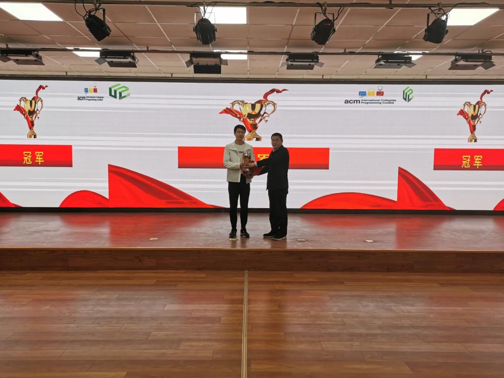 决赛经过五个小时的激烈比赛,最终卓越191班的李传坤获得了本次竞赛的冠军,同时获得了一等奖,获得一等奖另外四名同学是软工互202班的郭栋、软工移183班的李一鹏、软工网182班谢傲、软工网192班闫龙鑫。卓越191班的杨子涵同学获得了最佳女子奖。另外,还有10名同学获得了二等奖,多名同学获得了三等奖和优秀奖。