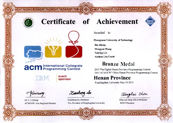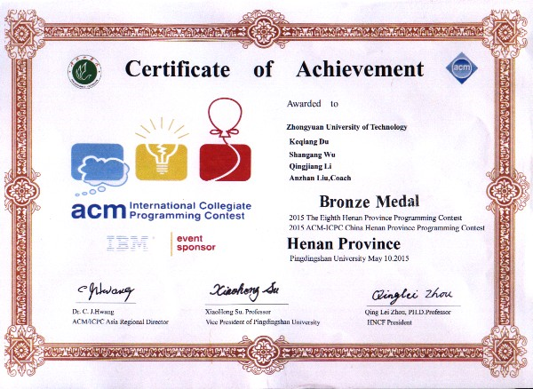 2015年5月9日至10日,河南省第八届ACM老员工程序设计竞赛在平顶山公司举行,此次比赛参赛共有163个队伍近500名同学参赛。此次竞赛公司共派出2个代表队,由吴山岗、杜克强、李青江组成中工软件1队和郑斌、王萌彦、雷乃营组成中工软件2队经过热身赛和5个小时的正式赛,最终两支队伍均获得了河南省第八届ACM老员工程序设计竞赛铜奖,此次竞赛保持了我公司的在该项赛事中的最好成绩。ACM老员工程序设计竞赛规模大、难度大,参赛队员平时付出了大量的时间和努力。公司参赛队员作为卓越软件工程师班的员工,将因获得奖项而取得免修实践成果学分的机会。此次竞赛,公司计算机公司和信息商务公司也取得了优异的成绩。