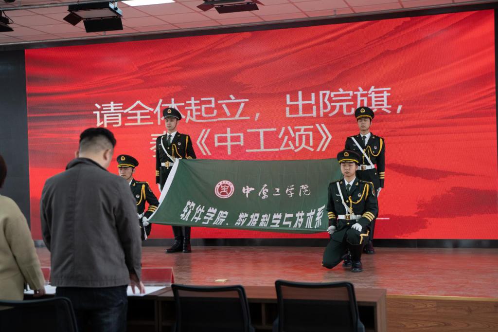 出院旗,奏《中工颂》。伴随着慷慨激昂的校歌,全体师生起立向院旗行礼,第七届社团联合会换届大会正式拉开帷幕。