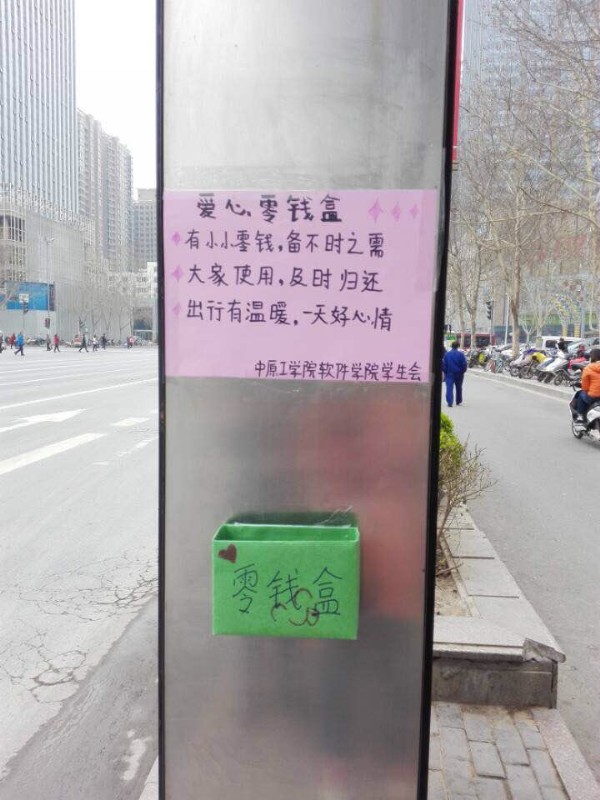 爱心零钱盒活动不仅为中原区市民带来了方便,更让同学们体会到了雷锋精神的精髓所在,在全院范围内营造了向雷锋同志学习,服务同学,服务校园,的氛围,增强了同学们的社会责任感。雷锋精神将作为一盏指明灯,引导同学们在爱心、奉献的道路上继续前行!