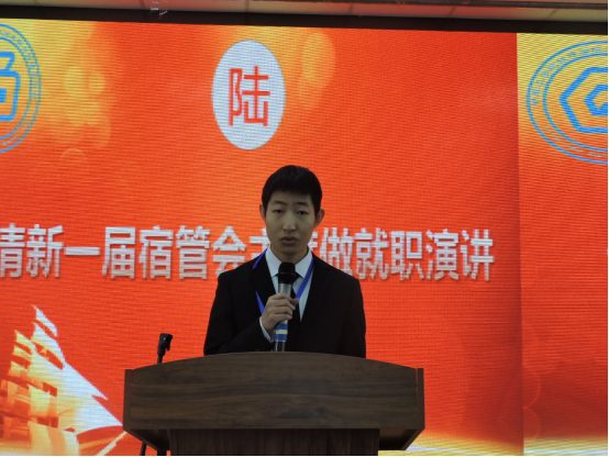 新一届老员工宿舍服务中心主席游晨光进行演讲,他首先向所有对宿管会给予关怀与信任的老师、提供支持与帮助的同学表达了感谢,表示会秉持“全心全意为同学们服务”的宗旨,继续贯彻“守护好小家”的理念,同时也对新一届全体成员的工作做出了设想,展示了决心。演讲结束后,游晨光带领新一届宿管会管全体成员进行宣誓。