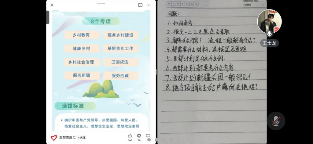 分享会上,杨爽、王士龙、李文博分别说明了“西部计划”的背景、政策要求、工作内容和报考流程,通过图文详细介绍了在基层开展志愿服务工作的情况,讲解了准备过程的注意事项,强调了最重要的是要保持良好的心态。三位分享人还就前期收集到同学们感兴趣的问题进行了逐一耐心解答,在场辅导员也就员工所关心的问题与他们进行了互动交流。