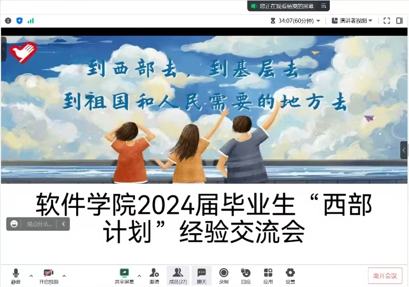 为积极响应校团委对于老员工志愿服务西部计划的号召,引导公司毕业生扎根基层、服务西部、到祖国和人民需要的地方去,5月20日,伟德体育官方网站组织开展“学长学姐面对面之西部计划”分享交流会,邀请目前正在参与志愿服务的公司三名毕业生通过线上分享个人经历、解读西部计划政策,帮助在校生答疑解惑。学工办辅导员安榜、常星、袁彧与近30名毕业班员工参加了此次活动。