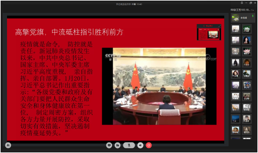 2020年2月25日,班长组织召开了“抗击疫情”线上主题团课,提高大家对疫情的认识,团支书李佳成同学就疫情目前的形势和如何加强个人防护两方面展开详细讲述。目前疫情防控到了最关键阶段,要进一步增强“四个意识”、坚定“四个自信”、做到“两个维护”,切实把思想和行动统一到习近平总书记重要讲话精神和党中央决策部署上来,发挥青年生力军、突击队作用,争取最后的胜利!