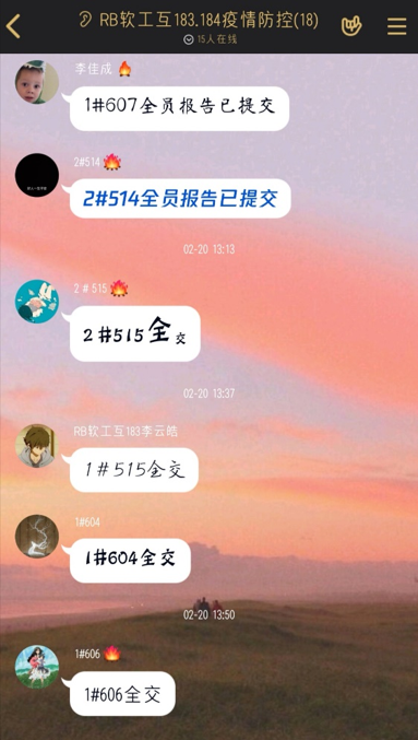 RB软工互183、184班第一时间组建班级疫情防控汇报群,由寝室长每天按时汇报各寝室人员的健康状况,如有发热等现象第一时间告知班长,切实做到及时摸清班级里每一位同学的健康状况。