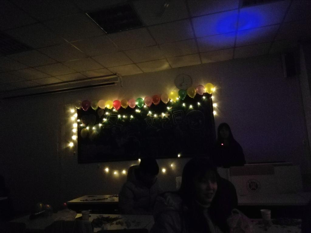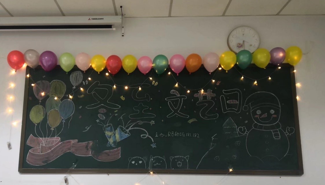 晚会开始前同学们提早来到教室使用气球及彩灯将晚会教室精心布置了一番,以“冬至文艺日”为主题的板报烘托了晚会温暖、文艺、愉悦的气氛。