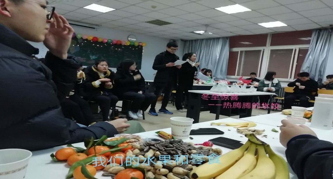在一片欢声笑语中,两位班长上前致辞,为大家送上冬至祝福。