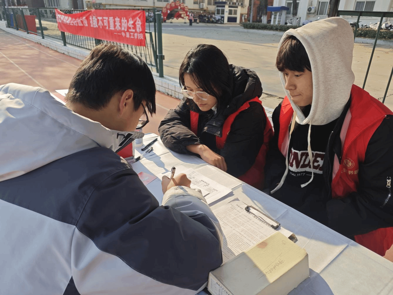 活动现场,氛围热烈而井然有序。献血车缓缓驶入操场,医务人员与员工志愿者迅速布置场地,迎接献血的师生。很快,献血点前就排起了长龙。同学们在登记处仔细填写个人资料表格,随后进入体检环节,医护人员对献血者的身体状况进行了细致的检查,确保他们符合献血标准。