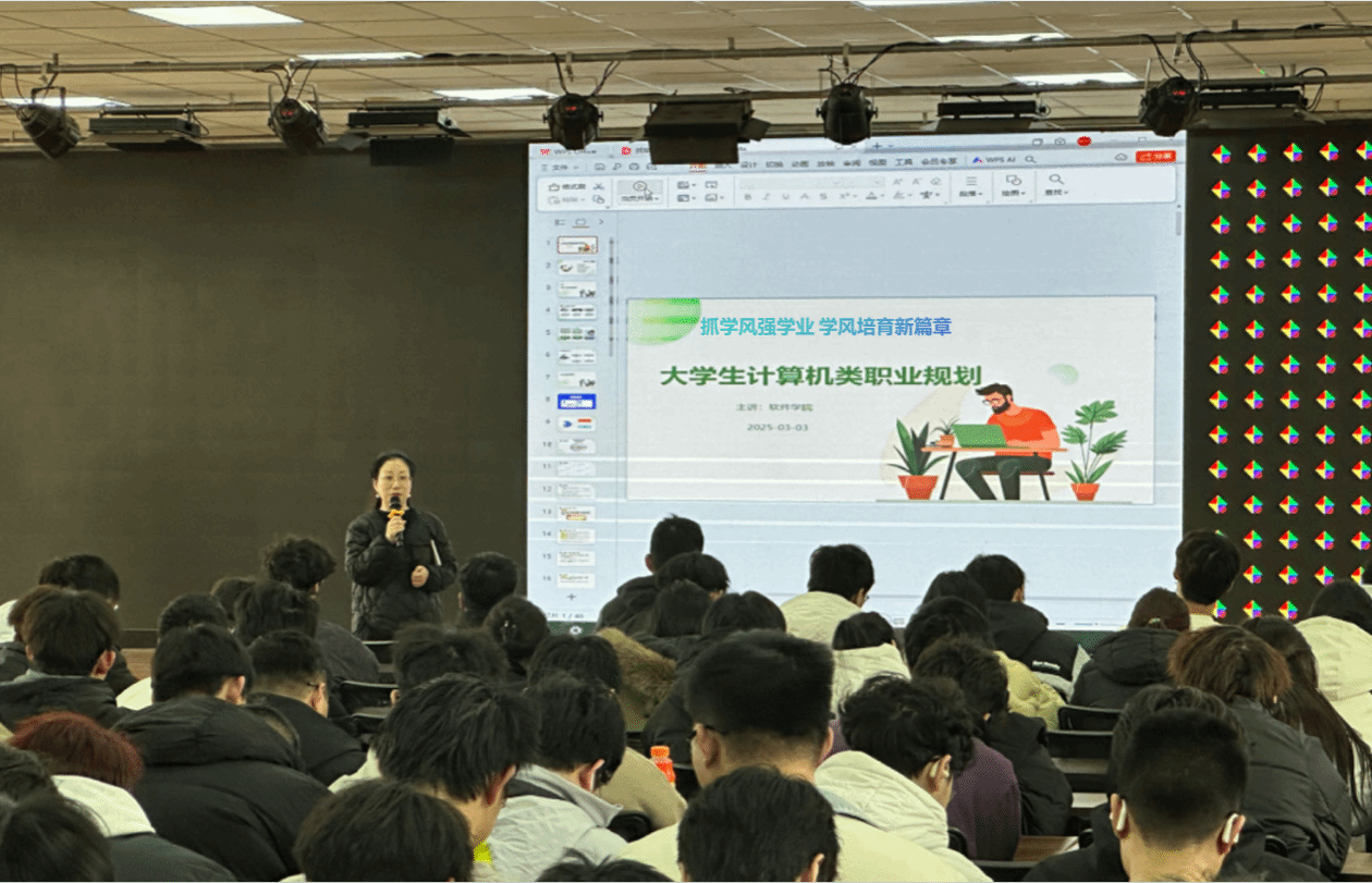 接着,党委书记王雪芳根据目前软件专业升学、就业形势从多个维度向同学们讲解大学四年该怎么做以及做什么。她深入剖析职业规划的重要性,结合事例为同学们勾勒出清晰的职业发展路径,她还围绕当下热门的考研趋势,分享了关键信息与实用建议,为同学们明确备考思路。此外,她还建议同学们积极考取专业资格等级证书,增强自身核心竞争力,为同学们的职业技能提升提供了指引。