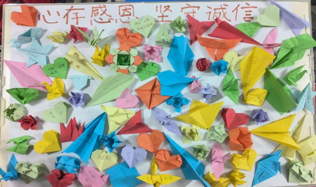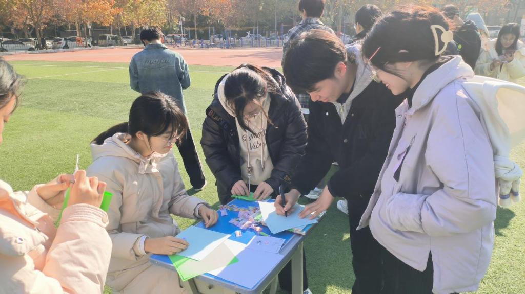 参与活动的同学可通过参加活动收集印章,凭借印章个数兑换奖品,也可通过套圈、开盲盒的方式赢得奖品。活动趣味性十足,吸引了众多同学驻足观看。同学们纷纷在纸上落笔写下浓浓感恩情,又将其折成各式各样的巧思造物,将载着满满的祝福卡片贴在了展板上。随着奖品数量的逐渐减少,黄昏悄然来临,此次活动也圆满结束。