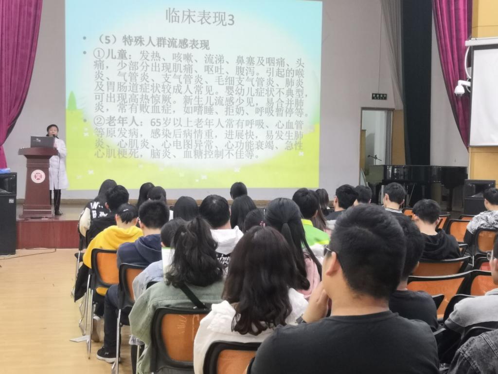 此次讲座邀请西区医务室陈夏主讲,她从“流感” “水痘” “肺结核”“腮腺炎”“麻疹”等几个方面介绍了这些疾病的预防措施以及治疗方法。她指出传染病重在预防,并建议同学们经常锻炼身体,增强体质,养成良好的卫生习惯。