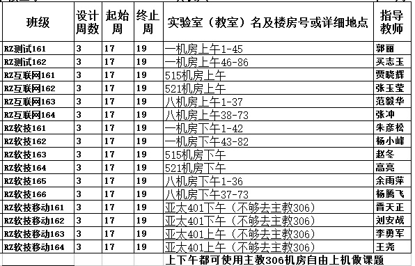 当前位置: 首页 >> 公司公告 >> 正文 17181学期专科三级课题北区机房安排 发布日期:2017-12-28 来源:伟德体育官方网站 点击: 各位老师,同学: 伟德体育官方网站17181学期专科三级课题即将在元月2号到19号进行。经多方协调先将北区机房安排公布如下:机房使用时间从17周周二开始,上午8:00~11:40,下午2:30~6:00,每班安排半天机房,如要在非安排时间继续做课题,可去主教306机房,或自寻以下机房空余座位,欢迎同学们自带笔记本,使用完后请将电源和网线还原。由于北区是艺术考试考点,希望同学们加紧完成实践课题,提交报告。 上一条:关于2017级卓越班级遴选通知 下一条:关于第十三届软件设计大赛决赛名单及时间的通知