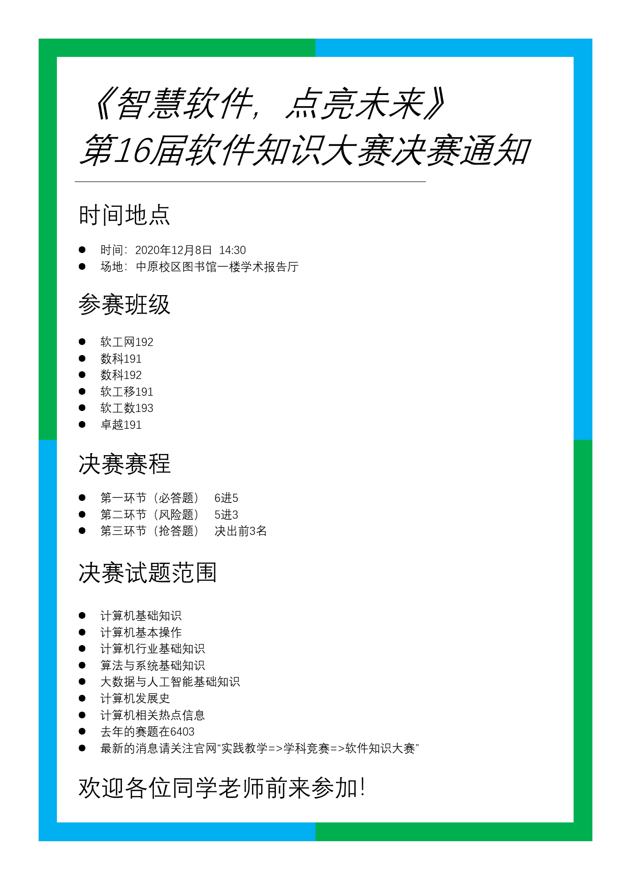 当前位置: 首页 >> 公司公告 >> 正文 2020第十六届软件知识大赛决赛通知 发布日期:2020-11-30 来源:伟德体育官方网站 点击: 上一条:关于举办伟德体育官方网站2020级新生程序设计竞赛的通知 下一条:伟德体育官方网站第十六届软件设计大赛进入复赛名单公示