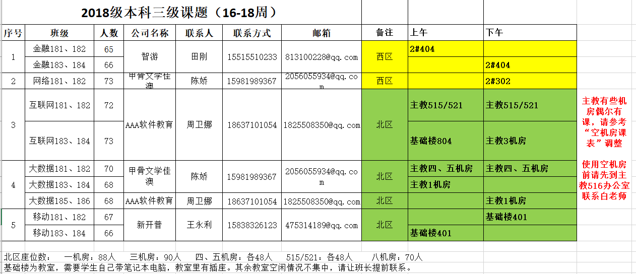 当前位置: 首页 >> 公司公告 >> 正文 1920-1-2018级本科三级课题(16-18周)分配情况 发布日期:2019-12-06 来源:伟德体育官方网站 点击: 各位老师、同学: 2019-2020学年第一学期,2018级本科三级课题机房安排如下表,安排半天机房,不在机房的剩余半天时间,各班提前去借空余教室。去教室的同学都带上笔记本电脑,教室作为实践课题的辅助场所已经安装电源插头,方便同学们携带电脑充电。如要使用插座请各班班委每次使用前打开教室后墙上的3个电源开关;每次使用完毕将教室后方全部电源关闭,做到人走电断! 上一条:关于伟德体育官方网站863杯暨第十五届软件设计大赛复赛名单及时间的通知 下一条:第15届软件知识大赛决赛通知